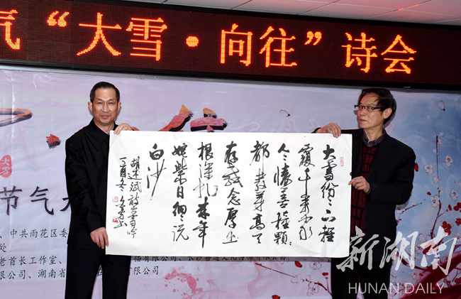 书法家荣文仿为潇湘诗会总策划胡述斌(左)创作的大雪节气诗歌《大雪吟》现场进行书法创作,并赠送给潇湘诗会珍藏。