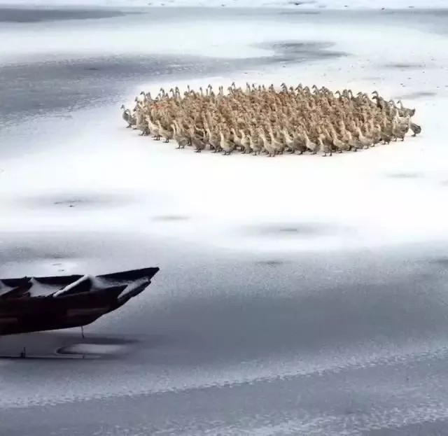 作品《冰上圆舞曲》,一群鸭子聚成一团,步履蹒跚地走在白色的冰面上,我们耳边似乎已经响起了鸭群欢快的叫声,片名十分贴切。