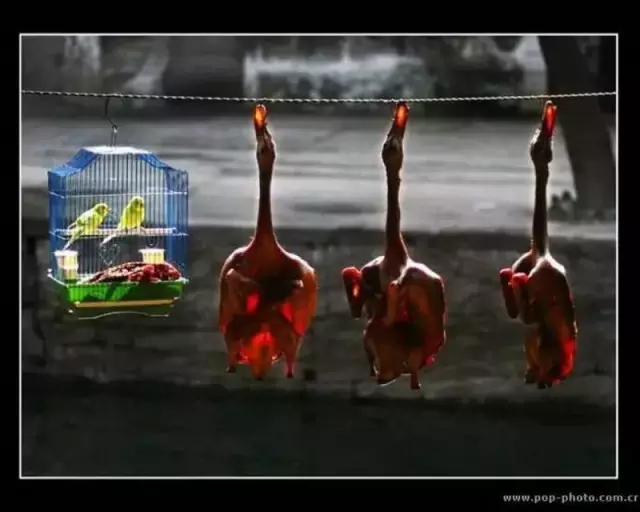 此外,成语、俗语也常被借用在摄影作品中。如作品《一目了然》、《挂人头卖猪肉》、《物以类聚》,作品很有趣,片名也精彩。