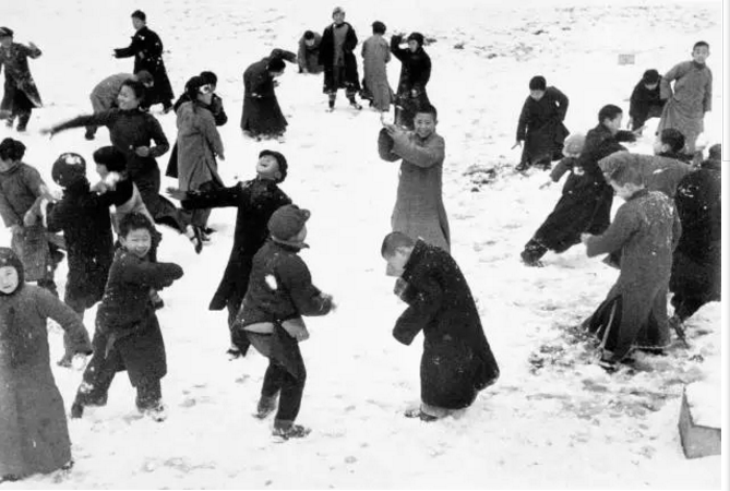一群孩子在雪地上打雪战 / 1938年3月,中国,汉口。