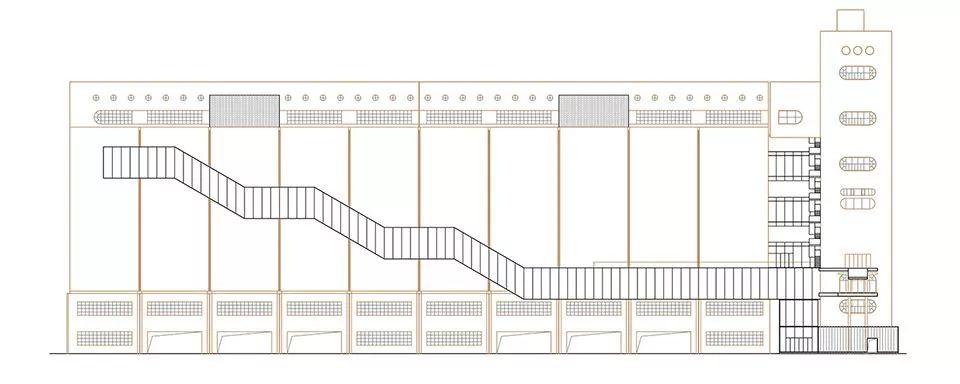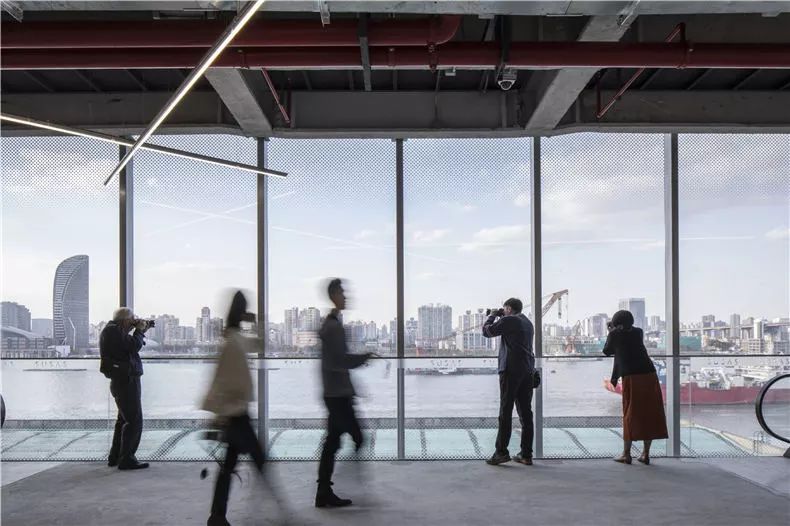 这个改造动作直面筒仓改造的主要矛盾:原本封闭的仓储建筑转化为公共文化空间时,如何获得必要的开放性?如何建立新时期中的时间性与场所感?这组外挂扶梯重新定义了八万吨筒仓的位置:通过引入浦江景色去揭示它坐落在黄浦江边这一事实,并将滨江公共空间带入这座建筑。建筑的公共性由此获得,一种新的时间也被铭刻在旧有的时间上。