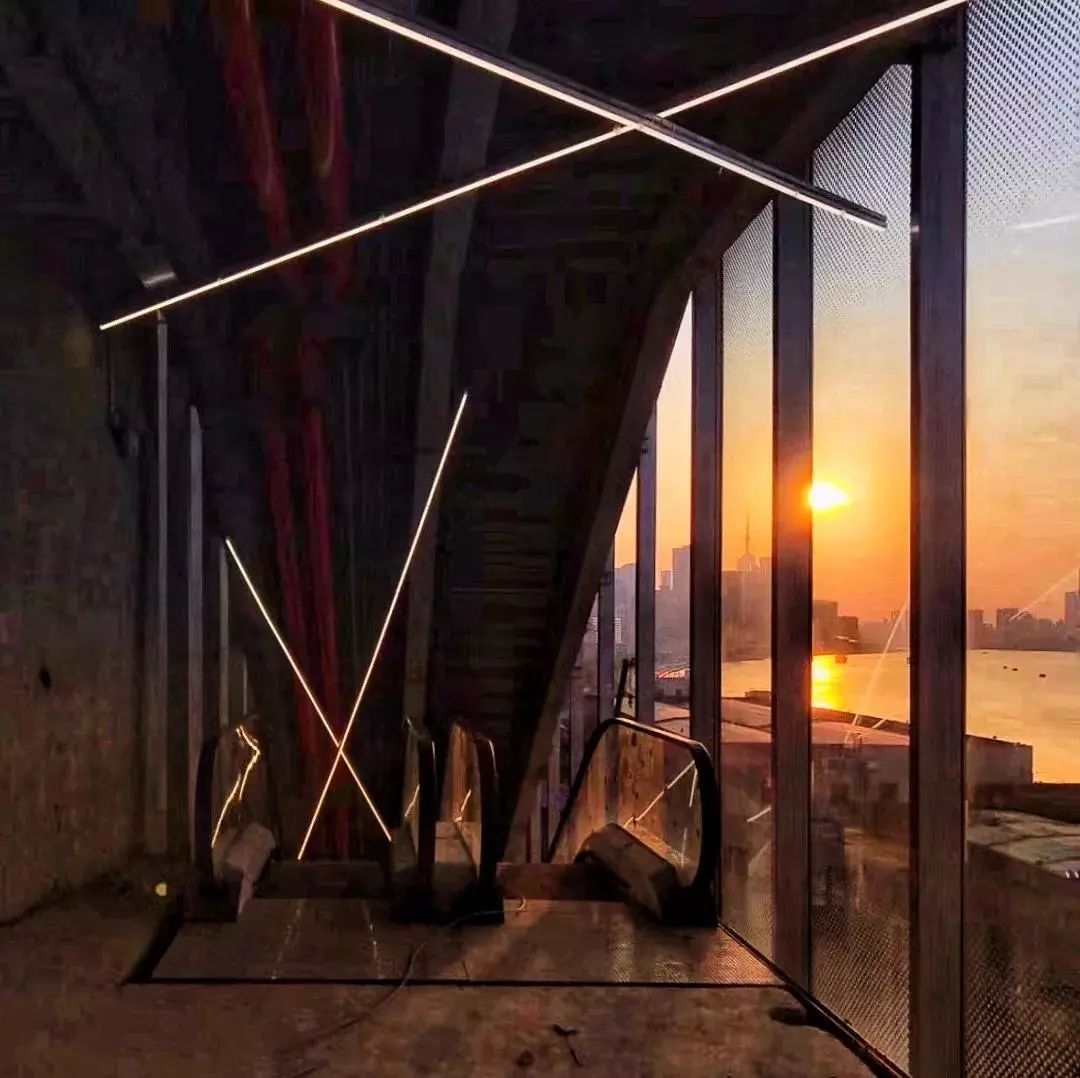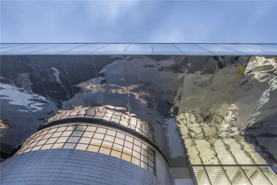 艺术家展望受邀于外挂扶梯底部进行合作创作,拥有独特拓片肌理的反射不锈钢板作为扶梯的底面装饰,倒映着民生码头周遭的景象,外挂扶梯的巨大体量也因此变得轻盈。