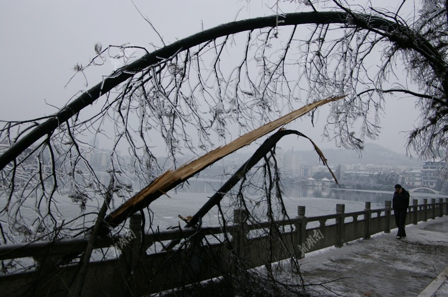 2008年1月29日,郴州市北湖公园,被大雪压断的树木。