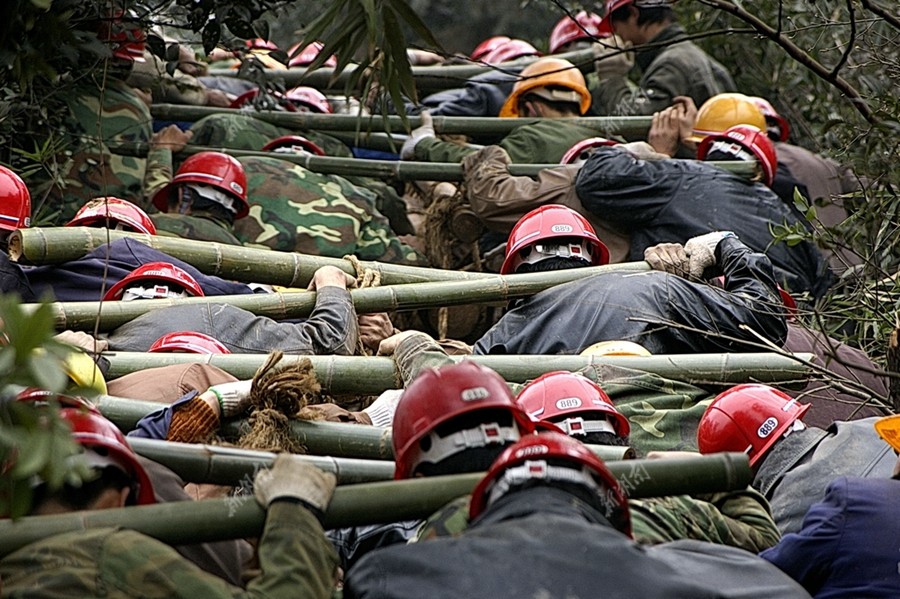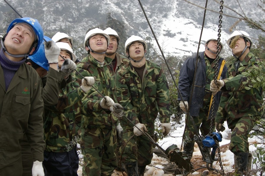 2008年2月8日,大年初二,来自全国各地的电力工人支援郴州重建电塔。