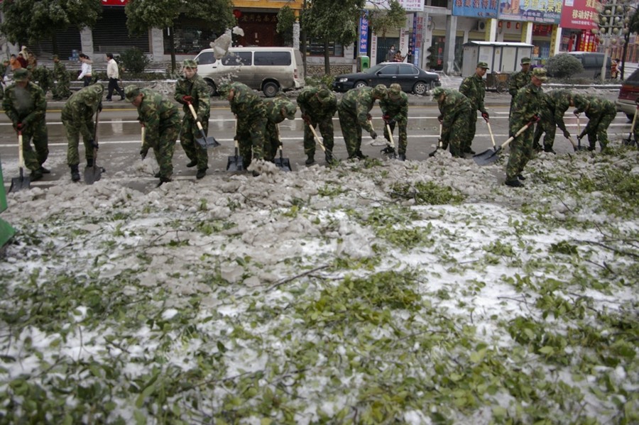 2008年1月27日,郴州市苏仙路,战士们在铲除道路上的雪。