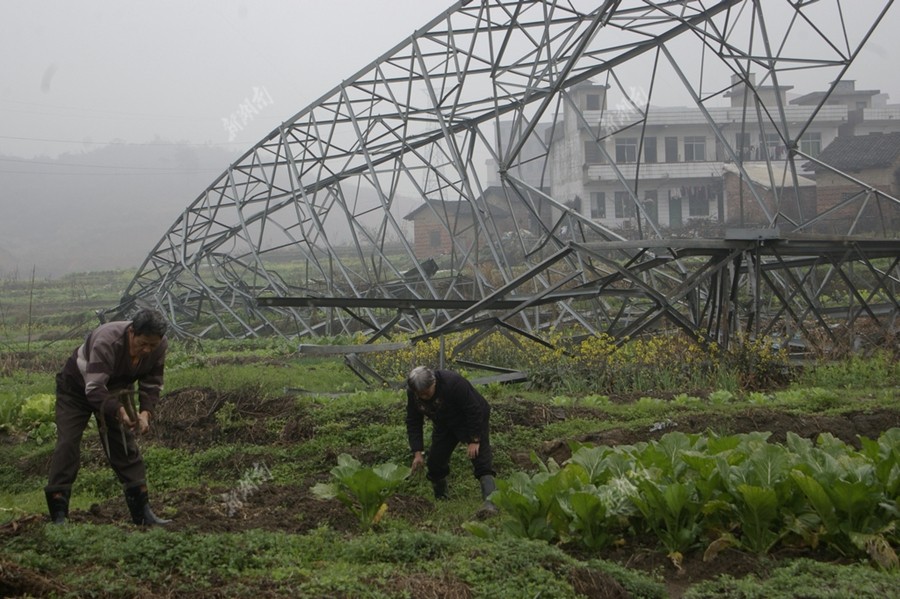 2008年3月11日,村民在倒塌的电塔下种菜。
