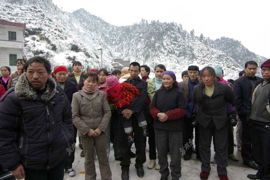 2008年2月13日,郴州市月峰瑶族乡,大雪封山半个月后,盼望得到帮助的村民们。