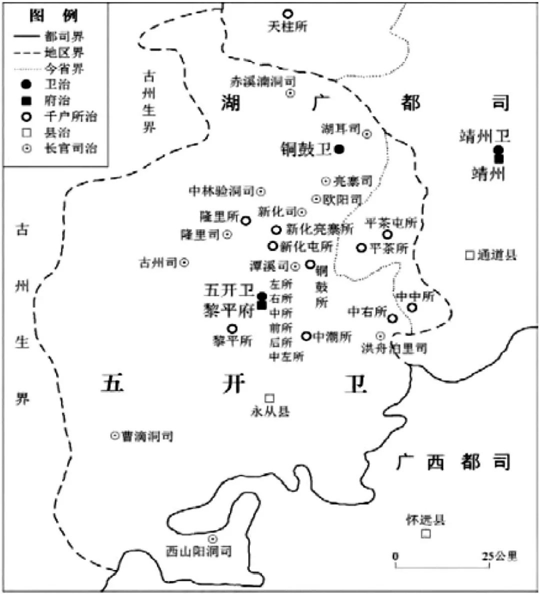 ▍明代湘黔桂三省交界亮江地区府、卫、司犬牙交错示意图