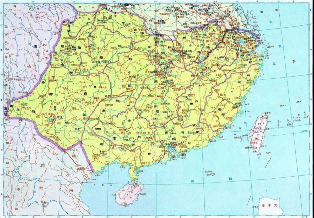 ▍《中国历史地图集》中的秦代「淮汉以南诸郡」图,将南方大片并未控制或只有松散控制的地区,标为同一种颜色