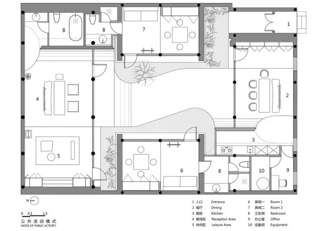 原本作为居住的空间,依旧保留其功能,四间房屋可被随时租用来进行休闲、会谈、聚会等公共活动;同时也可以作为带有三间卧室的家庭旅舍。