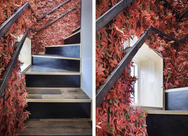 “挤压”,即这个错层的建立,让原本聚集一起没有隐私的空间打散成一个个独立的空间。每个房间的私密性得到了保证。室内室外空间交替的感觉,并对此做了强化:天窗下正对的鱼缸以及儿童房的凸窗,楼道中的红枫叶墙