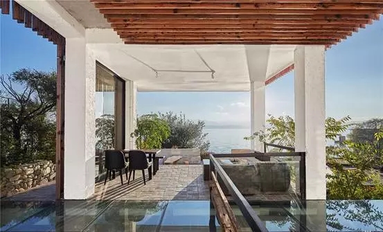 如何越过马路的阻隔,欣赏到洱海的水景?建筑师用半下沉的公共空间介入,通过石头墙围合的地空间,与水景产生心理上的呼应,架空的钢构平台,使得首层居住空间处于更高的标高之上,用台地化解高差,用景观化解突兀。平台右边所接的建筑是开敞的,底下上来的流线始终处在宽大的室外感之中,让二楼更有一种地景感而不是建筑感。