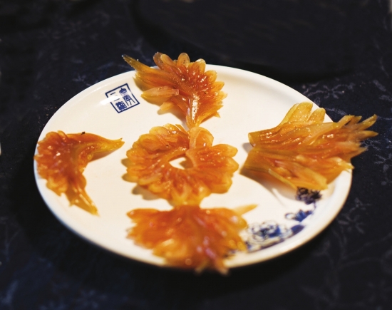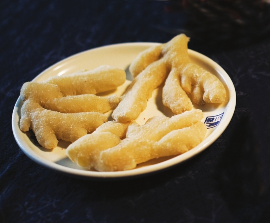 紫苏梅子是一款跟阳光、空气有着密切关联的零食。农历三月的紫苏用盐水泡后放在往年的梅子水里腌制,沥干水后,翻晒至干碎时收起来静候青梅成熟。农历八月初的冰姜需要大太阳的呵护才能“漂白”。冰姜在盐水缸中浸泡一个月后,遇上晴朗天气翻晒,才能上一层薄薄盐霜。农历五月底的刀豆花跟阳光的缘分更持久,编织好形状的刀豆花需放在日光下晒到两面漂白为止,再入糖缸腌制,三个月后,又要等候阳光将其晒干,直至不粘手。这中间,它至少晒太阳一星期。