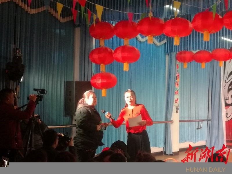 笔者跟随着人们的脚步,一起去一探究竟。三楼的一间大排练室里布置得井然不紊,灯光、音响、锣鼓、摄影机位一样不缺,一边是舞台,一边是观众,场地虽不大,但人气却很旺,观众席里座无虚席。舞台背景上的戏曲脸谱十分醒目,原来是泸溪县戏剧家协会2018春节联欢晚会正热闹上演。