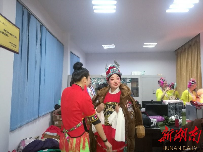 邓七芝是辰河高腔传习所省级传承人,此节目中与她搭档的邹舞曲是业余爱好者。表演结束后,在化装间卸妆的邹舞曲满脸兴奋:“第一次唱辰河高腔,我还怕唱不上去,今天还好,在邓老师的指引下,第一次表演还算成功。”