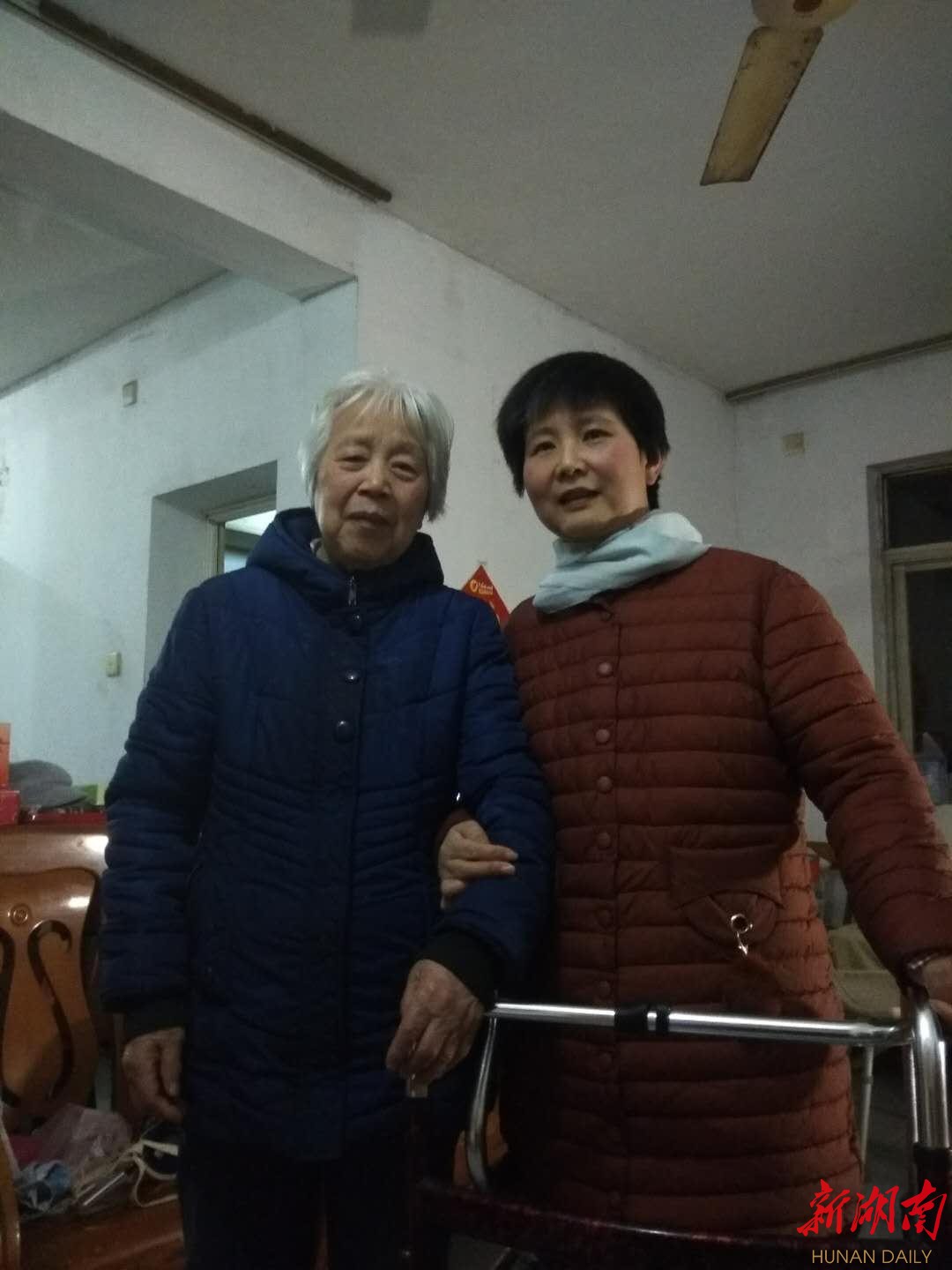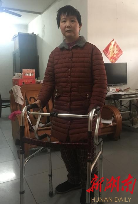 去年底,她在浏阳市集里医院进行了3个月的康复治疗,左腿竟然使得上劲了!如今,在简易助行器的帮助下,她在自家屋里也能缓慢兜几个圈。