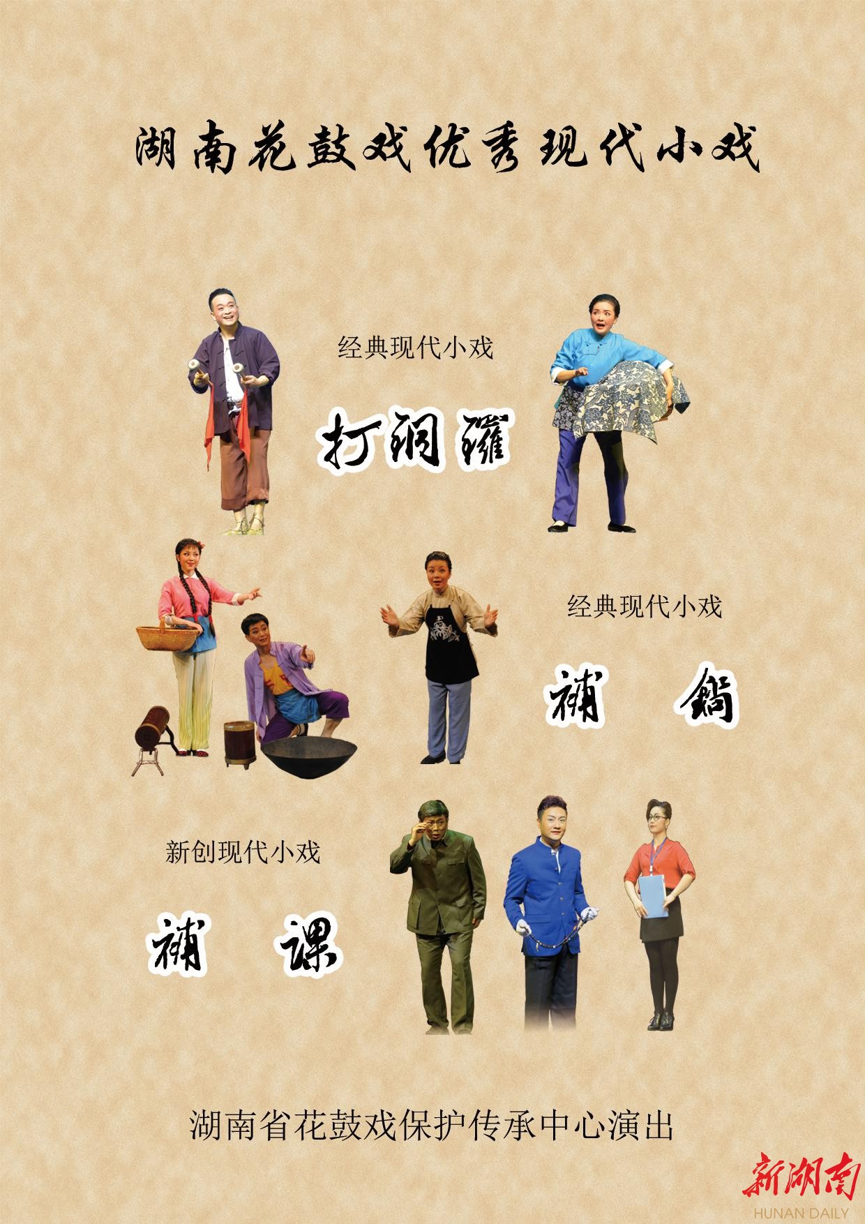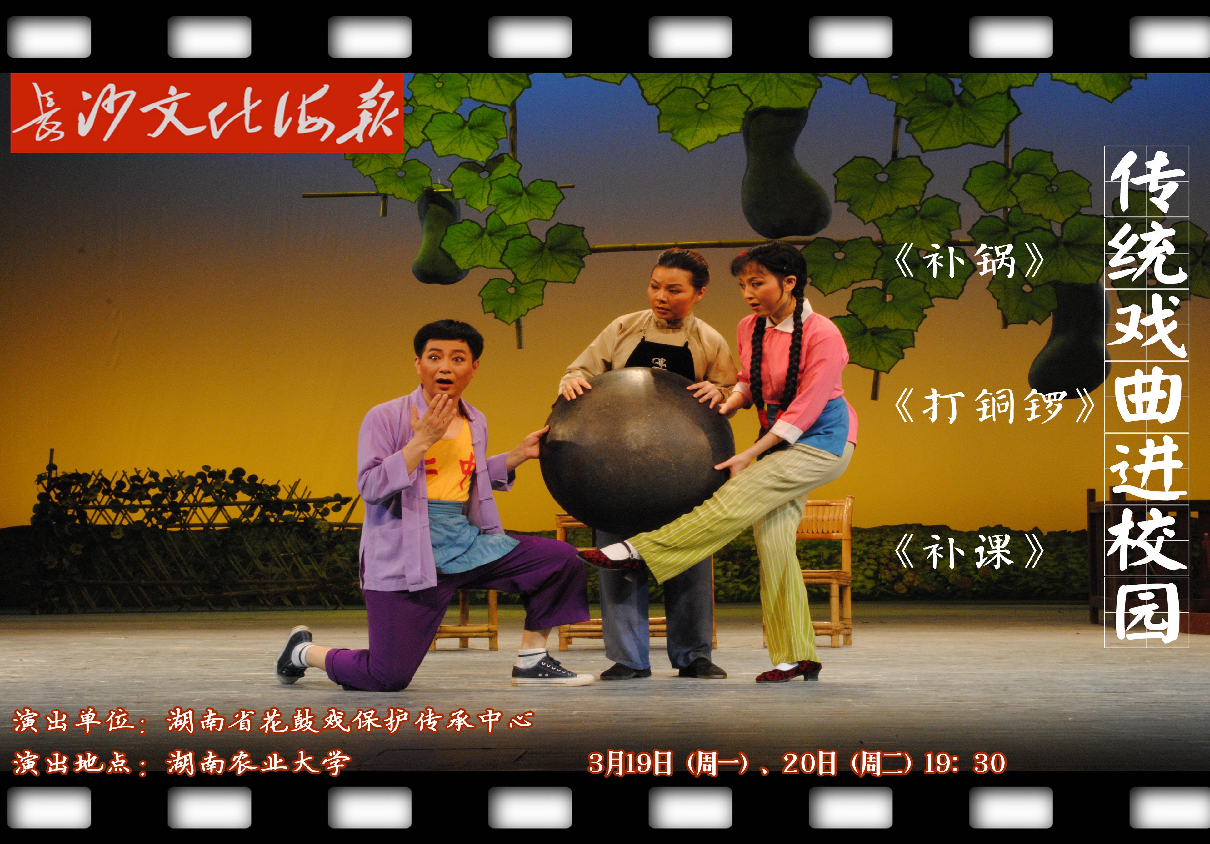 3月19日-20日(周一、周二)由湖南省花鼓戏保护传承中心演出的传统戏曲进校园优秀剧目——《补锅》、《打铜锣》、《补课》将在湖南农业大学上演。此次演出的首届全国喜剧优秀剧目展演以“传承经典,立足当代,引领发展,服务人民”为宗旨,以促进中国喜剧市场的繁荣发展为目标,挖掘长沙优秀的喜剧经典力作,以现代视角复排革新,重返大众视野。本次活动召集的作品,具备广泛社会影响力、市场号召力,集戏剧性与趣味性为一体。