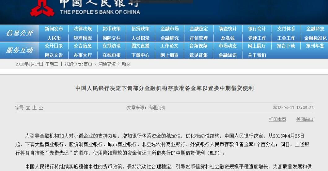 4月17日晚间,央行决定,从4月25日起,下调大型商业银行、股份制商业银行、城市商业银行、非县域农村商业银行、外资银行人民币存款准备金率1个百分点;同日,上述银行将各自按照“先借先还”的顺序,使用降准释放的资金偿还其所借央行的MLF。
