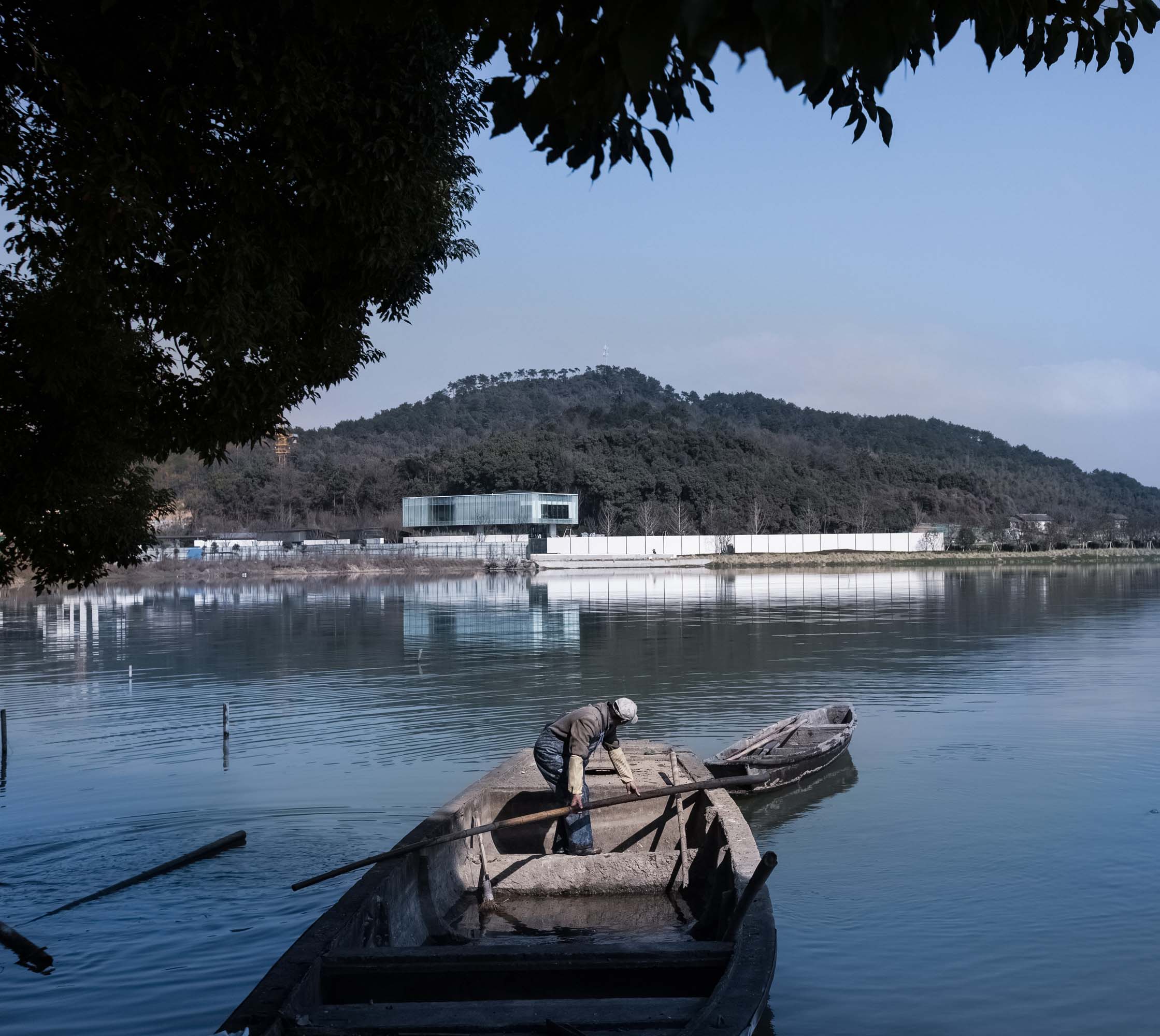 基地周边植物的种类相当丰富,常绿温带林木和落叶植物交相辉映,加上掩映在原始地形中的数棵桂花树,丰富的四季林地景观时刻提醒我们这里是城市和自然的边界。整个基地的高差也加强了林木和湖区景观的互动。建筑师从一开始踏勘场地就意识到建筑规划和环境存在两个层次的互动:首先是访客从湖面的几个方向接近基地,这一过程中不同的视点转换观察到的建筑体量关系变化;其次是接近3000平米的建筑如何以合适的体型与背景山体、前景湖岸融合。