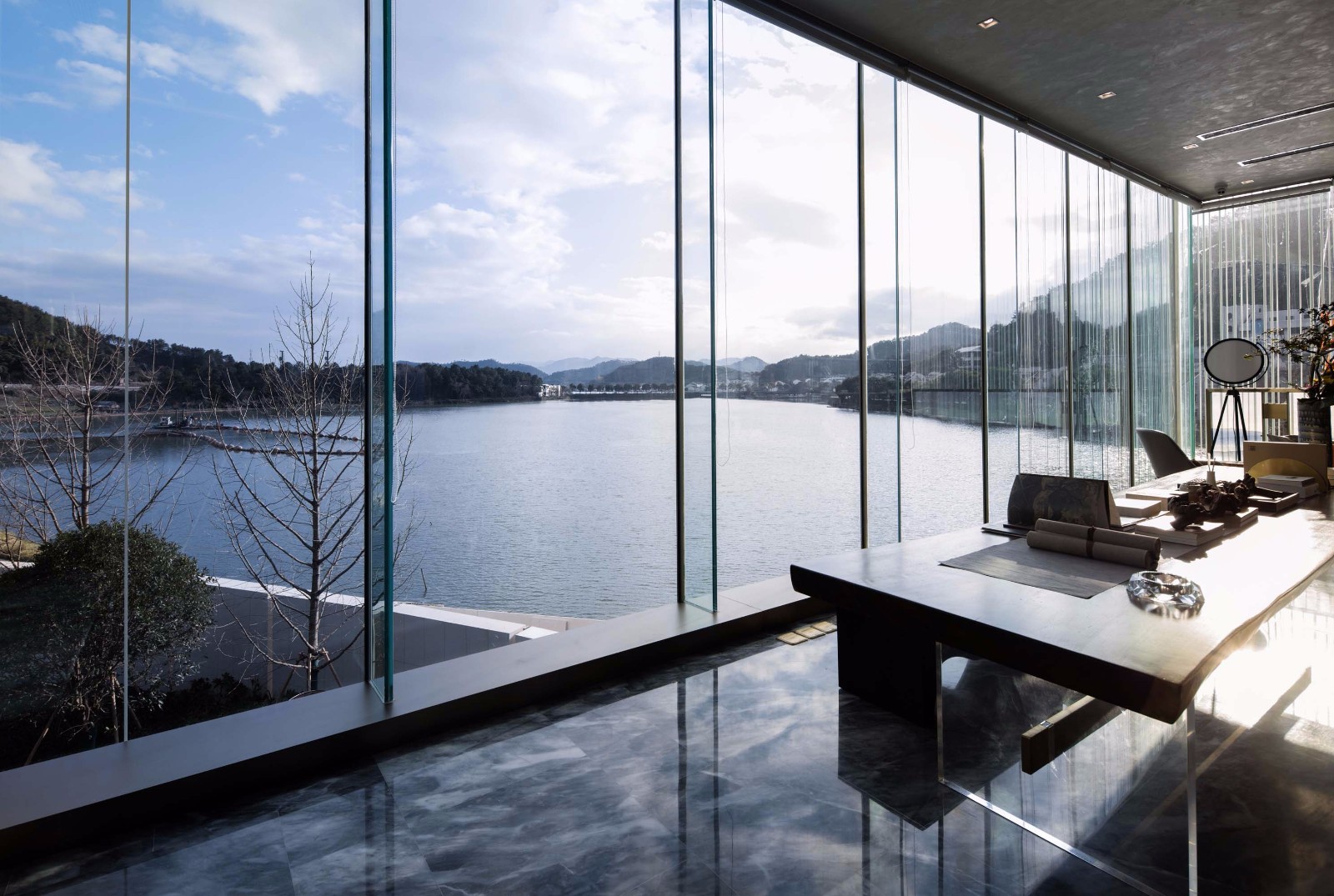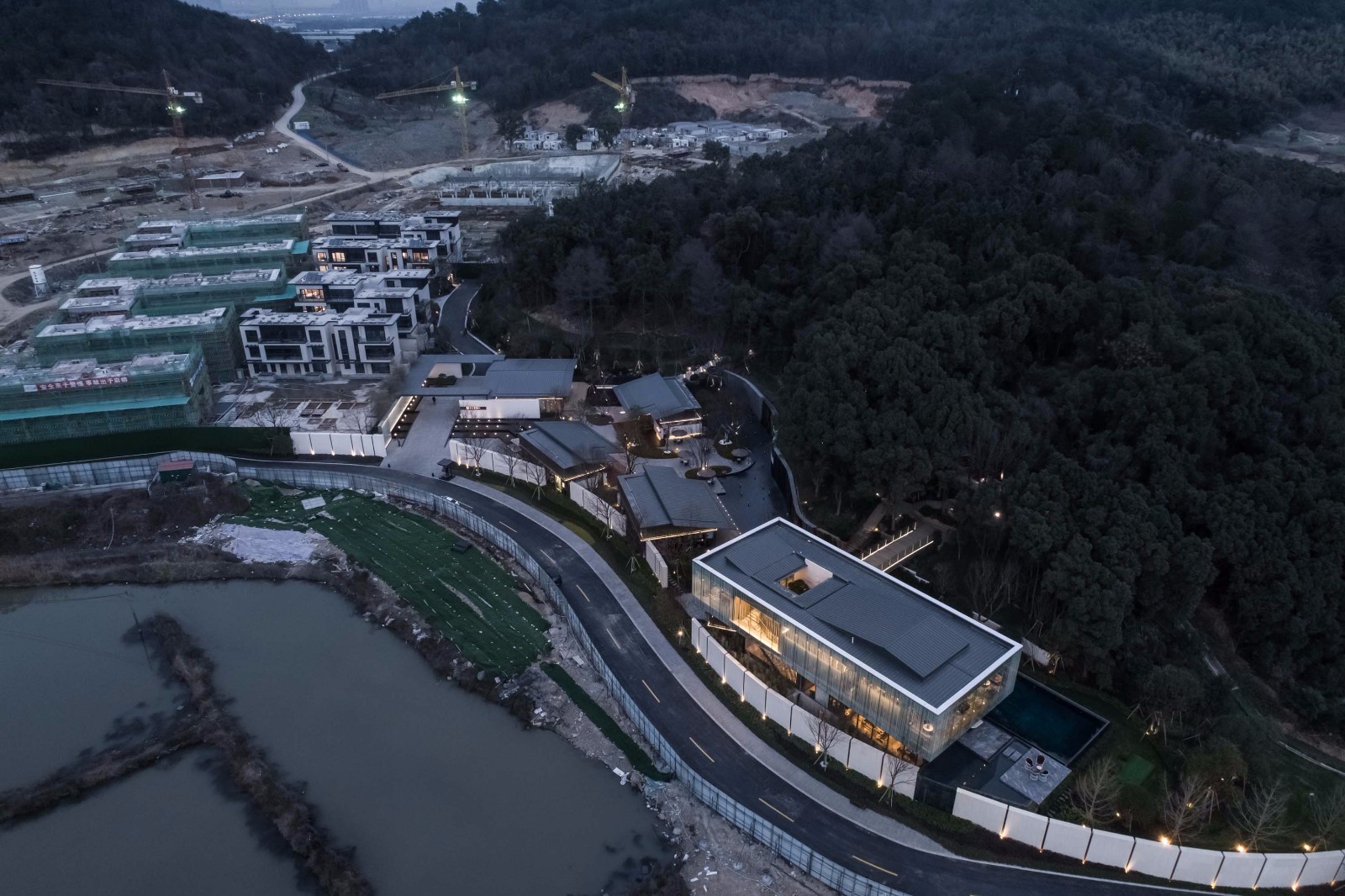 抵达建筑的本身也是一个体验建筑和湖山交互的过程;驱车从东钱湖南侧进入基地是最舒服的路线,也最能完整体验未来居住社区和环境的互动。向北远眺便能看到湖边轻盈的会所,接下来一路上便是丰富的湖山景色和多年形成的四季山体植被;行车至山前,建筑群才配合着一侧湖光徐徐展开。