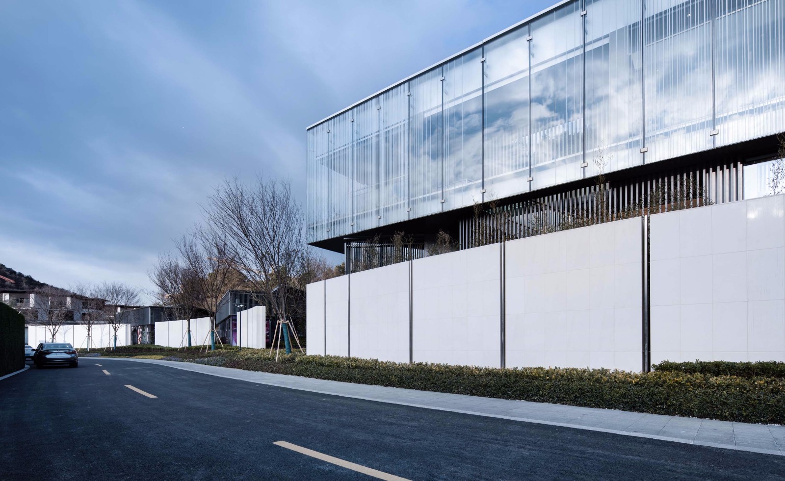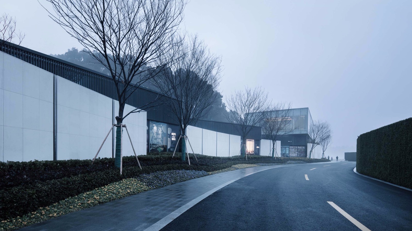 “边界”的意义还在于融合场地各种元素,同时“边界” 本身亦是对环境反馈作用后生成的场所。从功能上,场所提供的线性空间串接了“社区公共入口—访客接待—商业内街—会所”这一重要的体验流程。最后的决定是用单一体块组合的基本建筑语言,去适应功能、流线、风格等一系列复杂的需求,并通过角度、方向、材质的控制,积极与山体、与湖面产生对话。我们希望“墙”内外形成不同的感受,和沿湖一侧对比,山景一侧形成较为疏离的空间来呼应繁密林地构成的山景,这一处理最后实现的体验效果是理想的,来社区中心访客的行进过程从外部到内部均形成了不同的视觉焦点和体验。