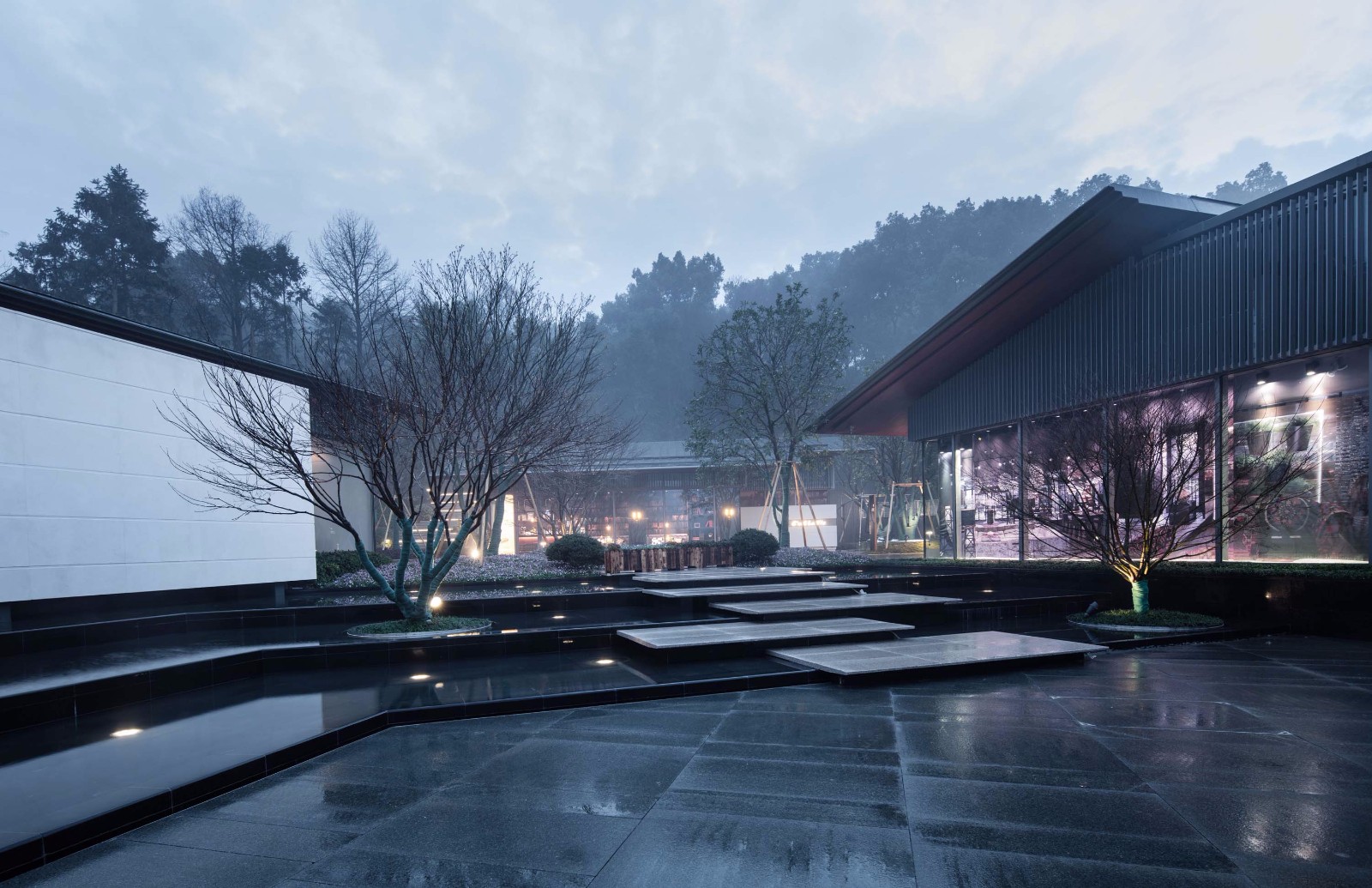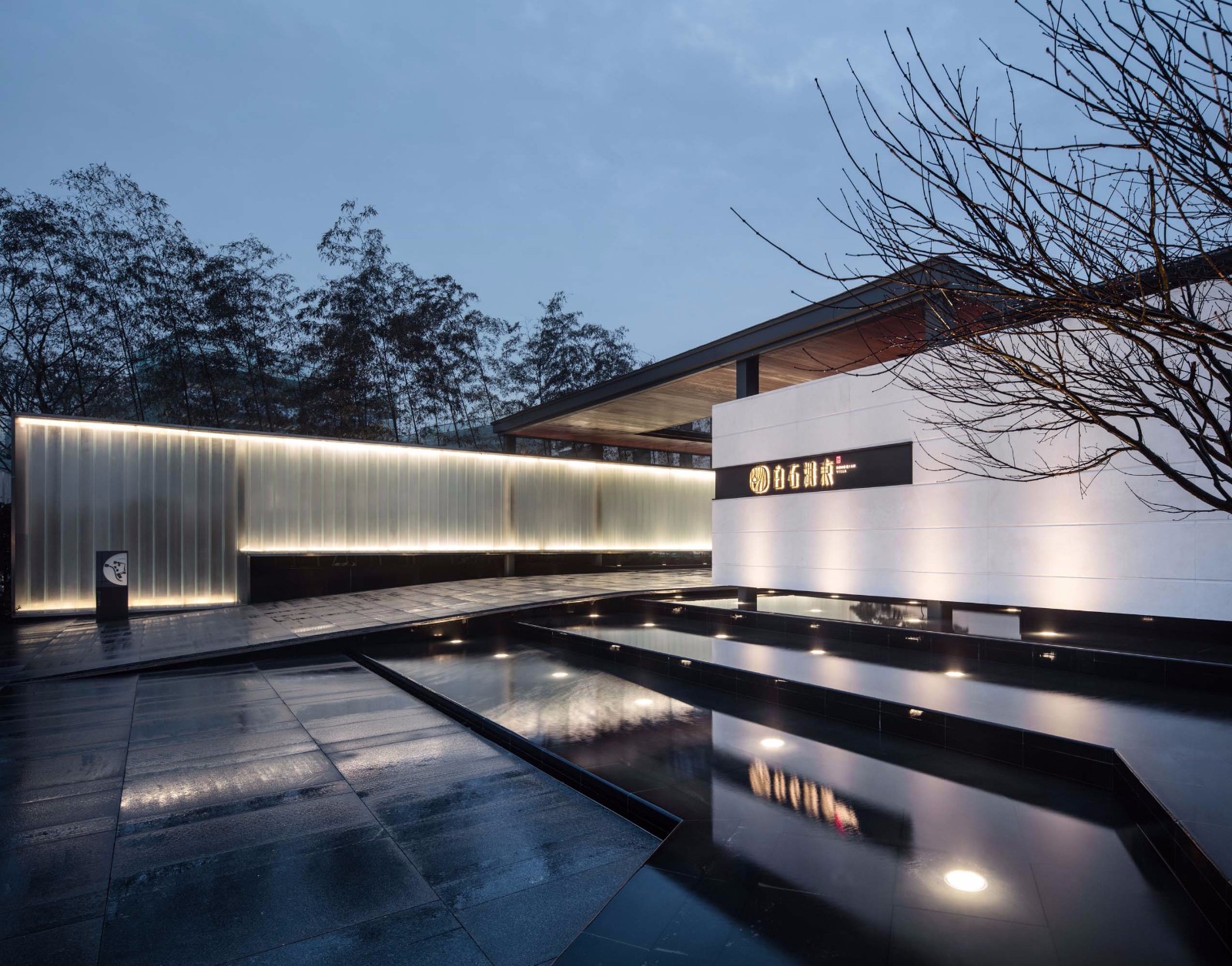 建筑群体的高度几乎在6米内,所以坡屋面的形式和材料需要能仔细的控制,最后采用直立锁扣的钛锌板在质感和构图上能较好融合环境。日式雨链的运用要求我们对建筑和景观构造做出相应节点连接处理,最后获得不错的现代化传统情境效果;金属百叶的形制为带弧线订制的T型截面,使建筑在不同的角度能呈现细致的光影变化;木色的檐下金属吊顶做了三次不等分收分,目的是削弱钢结构屋顶厚度,增加建筑轻盈感。不管是细部,还是整体建筑群体的空间组合上偏日本式庭园的尺度,除去情景打造的因素,我们认为这是一个切入点,也是可以将现代建筑的质感和相对传统的园林景观进行结合的表现手法。