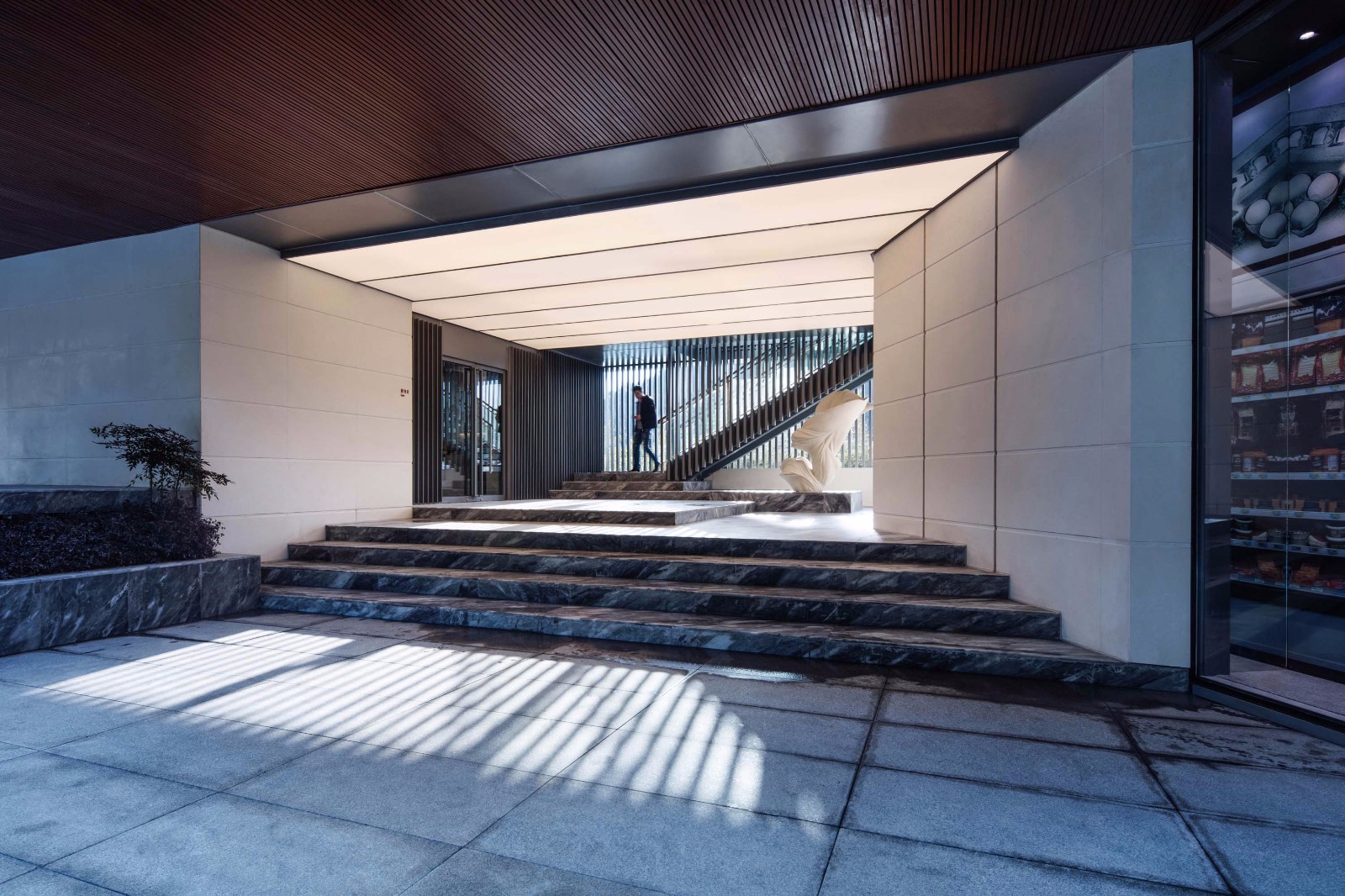 海派商业文明使宁波人眼界广阔,而扎实的制造传统令当地工匠技艺细致。考虑到住区品质的形象,业主希望能把细致的工艺和材料表现融入到整个建筑语言和景观环境中。会所的玻璃表皮采用1500X4500米的整块通高无框玻璃肋支撑幕墙,定制的彩釉玻璃通过竖向线条在立面不同朝向的疏密变化管控对外的视线,同时形成外观上的旗舰感受。玻璃上下线脚收边的控制材料构造分离的原则,确保立面不出现不同材料现场胶结的做法。屋顶结合中庭位置设置了一段坡屋顶,我们希望室内空间中植入一个空间层级,与环境产生呼应,站在住宅区阳台上眺望社区中心,屋顶肌理得到完整延续。