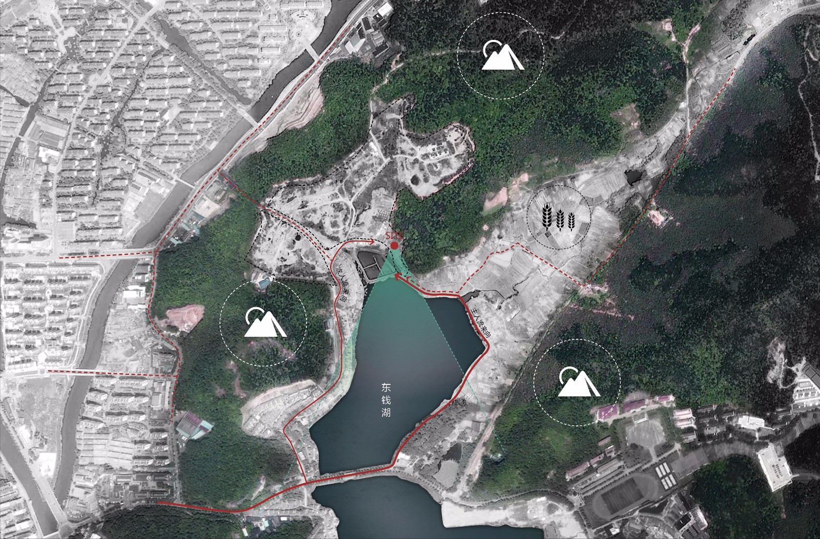 宁波“山水城林”的融合是城市的基础地理特征,超过西湖面积的东钱湖水域辽阔,和宁波市域内的江河一起构筑起宁波特有的水网体系,而环湖区的山脉河道村庄水乡构建起具有当地文化特色的景区。同时白石仙坪山提供的高差使未来的建筑和场地拥有良好的视野,湖山的空间层次构成了极佳的自然人文风景。