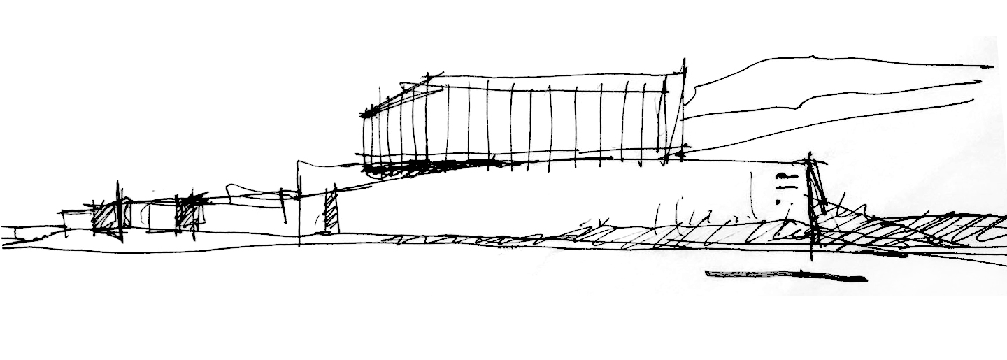 白石仙坪和谷子湖共同形成了用地狭长而不规则的形状,大住区位于地块西侧较为平坦的场地,我们认为“边界”是这块用地最显著的特征。特定的场所在建筑(住区)、山林、湖泊三者在有限的空间碰撞中产生。考虑到环湖路是进入基地的唯一道路,我们希望用建筑的手段加强这个边界的表现力,构思了三道清水混凝土的墙体将建筑平面轮廓和沿湖立面轮廓清晰地展示了出来,同时延长的“墙”形成了整个进入场地乃至住区戏剧化的第一层景观元素。