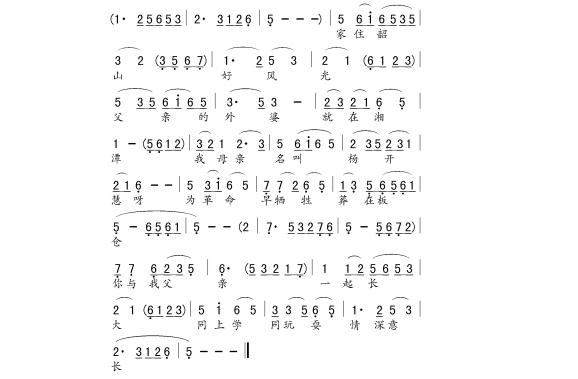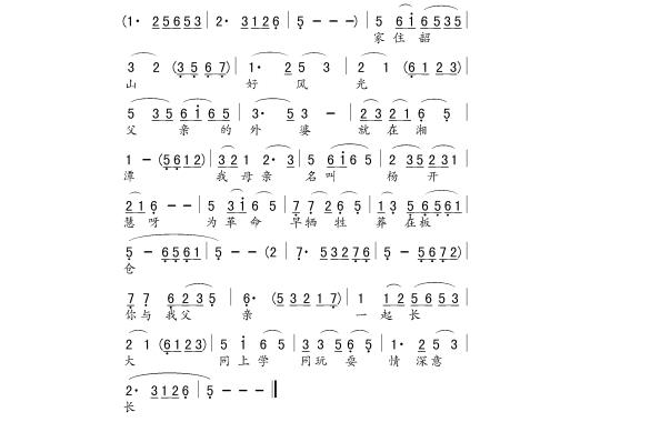 在写《老表轶事》时,考虑毛岸英用花鼓戏中的什么基调问题,也反复了好久。开始用的是【洞腔】,也可以。后来受到对白的启发,文有章:年轻人,看你眉清目秀,一表人才,应该要学好,不要在外头招摇撞骗……,这里的文有章根本不相信这个毛岸英是毛泽东的儿子。怎么样才能使文有章相信呢?只有用【浏阳河】的旋律来演唱,大家熟悉,又有地域特点。【浏阳河】出自湖南省花鼓戏剧院的《双送粮》,变成了全国都知道的歌了,为版权还打了不少官司,我们花鼓戏剧院能不能再用?应该这样说,它出自湖南省花鼓戏剧院的《双送粮》之中,是作曲者利用了一个湖南的民歌小调【三杯酒】形成了【浏阳河】,是花鼓戏剧院演出的剧目,花鼓戏剧院也是有版权的。电影《怒潮》的插曲《送别》,是利用了花鼓戏《打鸟》的“毛姑娘绣花”一曲,是不是我们这个“毛姑娘绣花”也从此不能唱了?还有时乐濛用花鼓戏的【西湖调】写了二胡曲和广播体操曲,是不是我们的【西湖调】也不能唱了?所以【浏阳河】被用在毛岸英的唱腔之中,还用得非常好,合情合理,适合当时当地的人物感情。配合唱词一唱 ,文有章才有:婆婆子哎,咯真是我老表的崽哩(一把紧紧地抱住岸英)。下面将这段曲抄出,供对照。自这段出来后,把毛岸英的出场曲都改了,成为毛岸英的一个符号。