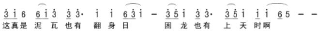 在音乐上,顺应了这种要求和需要,来了一些与文有章有对比的音调。就是【打锣腔】类型的【讨学钱】和【嫂子调】,把它处理得更加夸张、动感,符合人物的特点要求。
