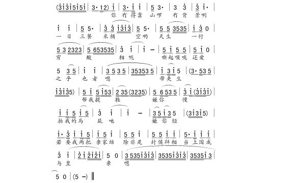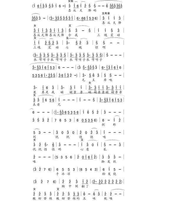 这是其中的一段,大部分文有章的唱段都有女声的伴唱。文有章是男声,把女声加进去,有色彩,既有对比,又有描写,主要演员没有那么费力,从这个戏来看,此举是成功的。