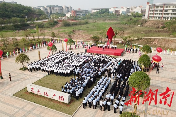 新湖南客户端4月5日讯(通讯员 文/何素淑 图/彭晶晶 记者 唐曦)“生命有长短,命运有沉升……所幸我的生命,能化成匍匐在华夏大地上的一根铁轨,也算是我坎坷人生中的莫大幸事了。”为继承和弘扬詹天佑以身报国的爱国主义精神和精益求精的工匠精神,湖南高速铁路职业技术学院在新校区校门入口正中央修建了詹天佑广场。4月3日上午9时许,由佛山三骏公司捐赠的詹天佑铜像在广场落成揭幕,1000余名师生共同见证揭幕仪式。