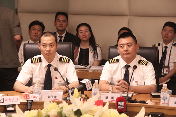 5月16日下午,机长刘传健(左)和机组成员与媒体见面。