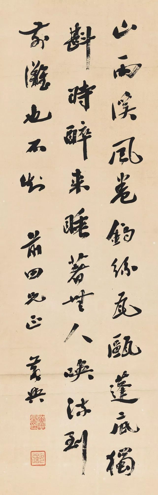 释文:山雨溪风卷钓丝,瓦瓯篷底独斟时。醉来睡着无人唤,流到前滩也不知。