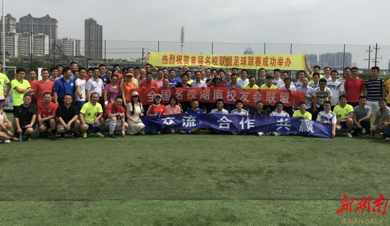 新湖南客户端5月20日讯 今天上午,晴空下的长沙金鹰飞翔体育公园绿茵场上,来自省外15所“985”高校的近百名校友见证了湖南历史上首个“名校联盟”的成立。