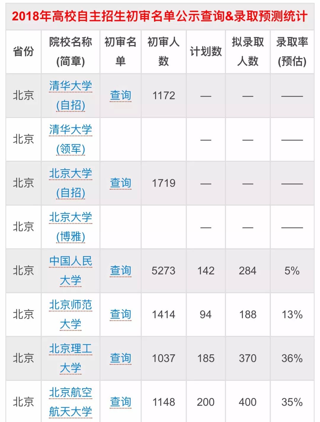 近日,教育部阳光高考平台公布了2018年自主招生报名审核通过名单,最受考生和家长关注的清华大学和北京大学的初审名单都已公示。