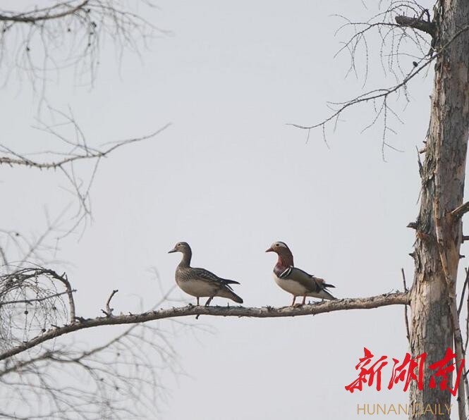 (鸟苏里江边上的饶河境内,鸳鸯在林间求偶。)