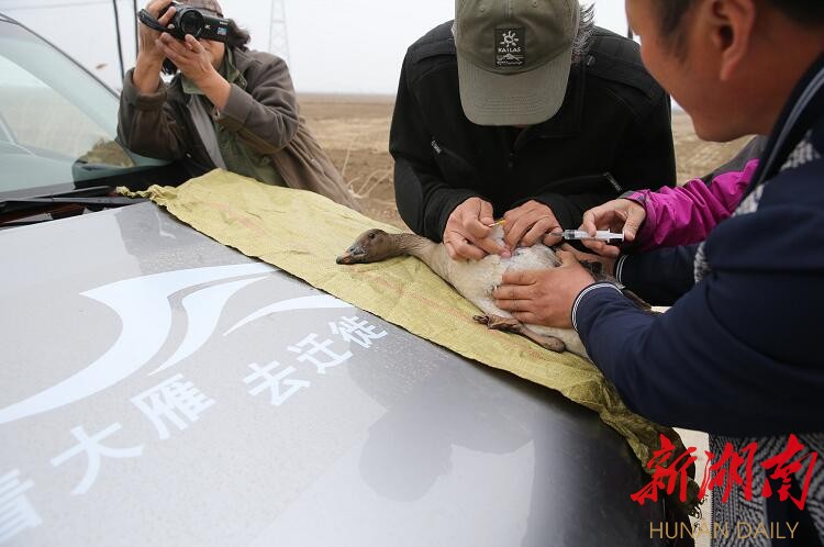 林伟说,昨天也救了一只,打了阿托品后,今天就放飞了;但现在没有了阿托品。车队队医王敏老师说,她随车带了阿托品,便在现场铺开一块化纤布,给这只豆雁注射阿托品。