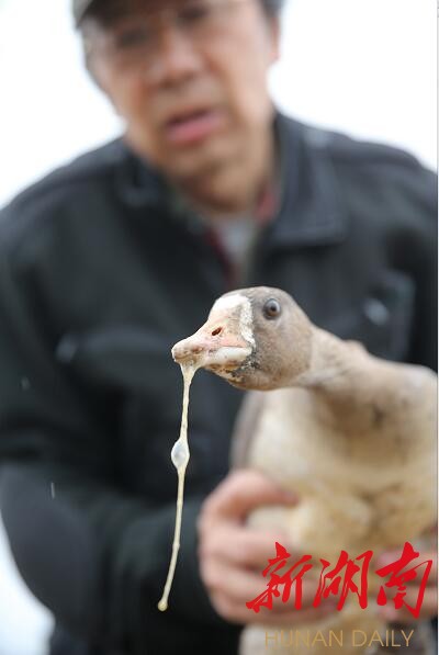 (一只白额雁中毒后口吐白沫。张京明摄)
