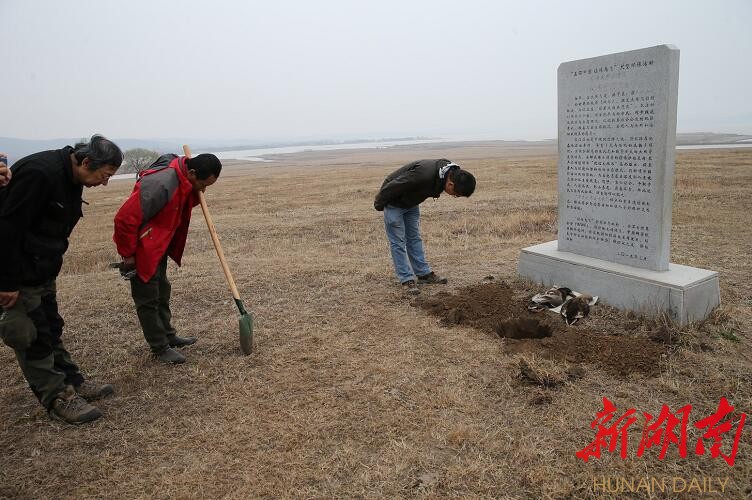 志愿者将两只刚死的绿头鸭带到04号碑,下葬。