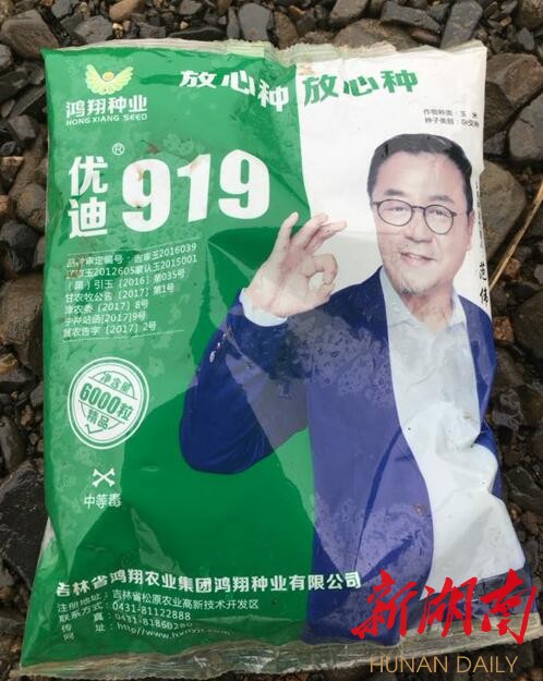种子由吉林省鸿翔农业集团鸿翔种业有限公司经营,生产商为甘肃省张掖葵花种业有限责任公司。包装注明“中等毒性”,拌药成份含克百威、福美双、戊唑醇、精甲霜灵、咯菌腈等。笑星范伟为其品牌代言人。