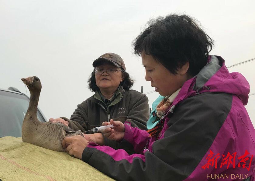 (志愿者为豆雁注射硫酸阿托品解毒。张京明摄)