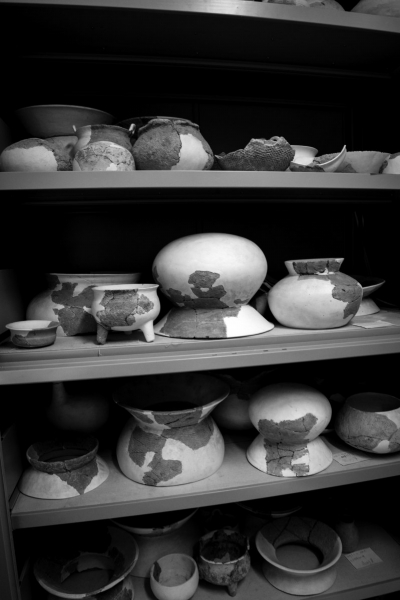 在隔壁一间看起来空荡荡的房子里,她们的两位同事正坐着板凳在地上整理满地的碎片,这是修复前的准备工作。同一个探方出土的文物被整齐地按照编号排列,即使是这样,整理的工作难度也非常大,因为历史的久远,发掘出的文物大多已破损,看起来就像是要完成无数个没有原图的拼图游戏,特别是灰坑中的文物,更是零碎不堪。其中一位大姐对我说,自从她做了这工作之后,就再也没玩过拼图游戏了,因为那个实在太简单了……
