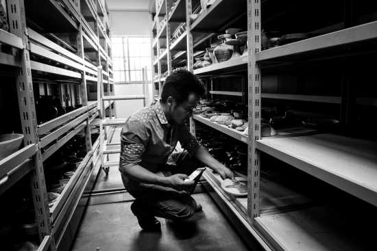 在修复基地看到老胡时,他正在搬运一个里面塞满了泥土的多角魂瓶,多年艰苦的工作让他患上了腰痛的毛病,搬运起来略感吃力。作为发掘一线的工作者,常年的风吹日晒雨淋让他看起来颇有些沧桑。