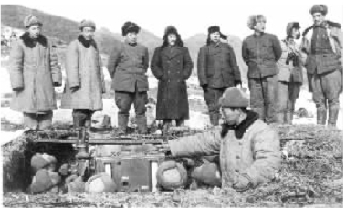 陈赓(左六)与彭德怀(左三)、邓华(左四)等在朝鲜战场视察阵地。