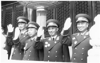 陈赓与粟裕、洪学智等在天安门城楼上。