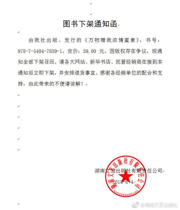 6月4日,湖南文艺出版社官微贴出了下架通知函:“由我社出版、发行的《万物赠我浓情蜜意》,书号978-7-5404-7839-1,定价:39.9元。因版权存在争议,现通知全部下架召回。请各大网站、新华书店、民营经销商在接到本通知后立即下架,并安排退货事宜。”