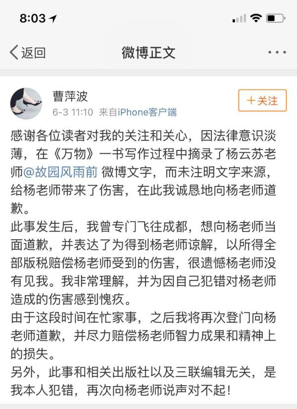 目前曹萍波已通过个人微博向杨云苏致歉,《万物赠我浓情蜜意》书中文章原刊载方《三联生活周刊》也发表声明,称已将这些文章从杂志公众号中删除。杨云苏则在6月5日发布的微博中表示,此事已经全权委托律师处理。