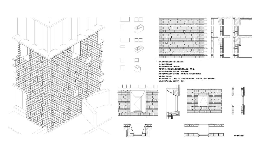 建筑装饰材料应蕴涵康巴藏区建筑粗犷、纯朴的感觉,应具有强烈的整体性。经过反复比选,建筑主体外墙装饰材料采用不同模数的混凝土空心砌块砖通过钢筋拉结自由叠砌,表现出与传统石材垒砌墙面在构造方面的契合:一方面再现了藏式建筑粗矿的表面肌理;另一方面减轻了外墙材料的自重和构造难度,同时也降低了造价。